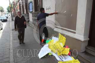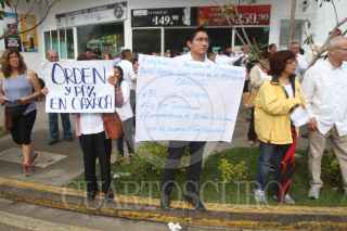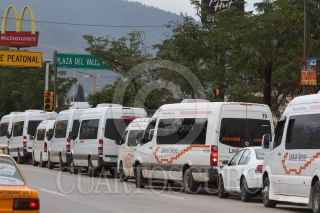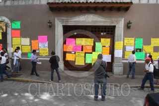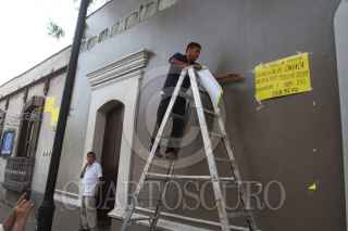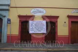 OAXACA, OAXACA., 08AGOSTO2016.- Comerciantes quienes forman parte de diversas cámaras empresariales y de trasporte como COPARMEX, Canirsc, Cmic, entre otras de carácter local realizaron este lunes un paro de labores para presionara a los tres ordenes de gobierno a restablecer el estado de derecho, el cual acusan ha sido violentado por parte de la sección 22 de la CNTE. Los manifestantes colocaron en el exterior de sus comercios algunas lonas en las que demandan paz para la entidad. Asimismo colocaron diversas pancartas en la Casa Oficial -hogar y oficina alterna del gobernador-, donde exigieron al mandatario, Gabino Cué la aplicación de la ley. Tras el retiro de los manifestante guardias del gobernador salieron del inmueble para retirar las cartulinas que minutos antes habían pegado los comerciantes. Ante la falta de camiones urbanos, personas comenzaron a transportar a las personas por la cantidad de 10 pesos, mientras que el costo del pasaje es de 7 pesos. FOTO: ARTURO PÉREZ ALFONSO /CUARTOSCURO.COM