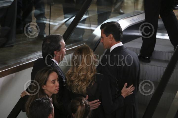 CIUDAD DE MÉXICO, 08AGOSTO2016.- El Presidente de México, Enrique Peña Nieto, y su esposa Angélica Rivera, acudieron a darle el pesame a Emilio Gamboa Patrón, coordinador de los senadores priistas, por la muerte de su esposa María Angélica Miner, quien fue velada en una funeraria de Santa Fe. FOTO: SAÚL LÓPEZ /CUARTOSCURO.COM