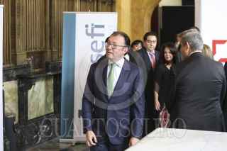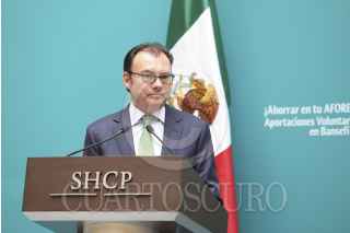 CIUDAD DE MÉXICO, 10AGOSTO2016.- Luis Videgaray, secretario de Hacienda y Crédito Público (SCHP), encabezó el evento "¡Ahorrar en tu AFORE nunca fue tan facil!", el cual busca incentivar las aportaciones voluntarias de los trabajadores a tráves de Bansefi y por celular vía Transfer, en instalaciones del Palacio Postal. FOTO: CUARTOSCURO.COM