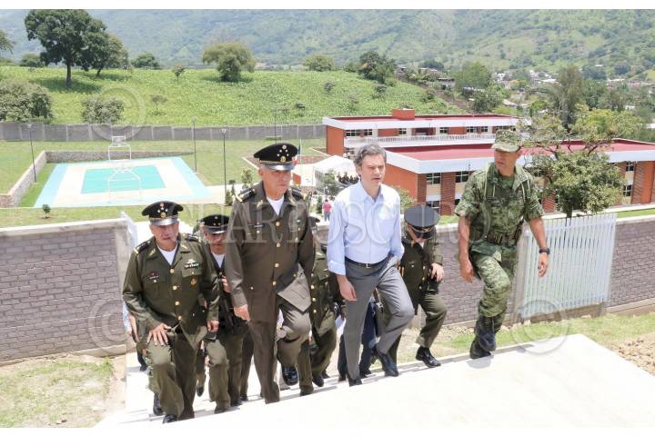 COALCAMÁN, MICHOACÁN, 10AGOSTO2016.- Silvano Aureoles Conejo, gobernador de la entidad; Salvador Cienfuegos, secretario de la Defensa; Aurelio Nuño, secretario de Educación Pública, y José Misael González Hernández, presidente municipal de Coalcamán, durante la inauguración de la escuela primaria Jesús Romero Flores, en las instalaciones del 65 Batallón de Infantería. FOTO: SEP /CUARTOSCURO.COM