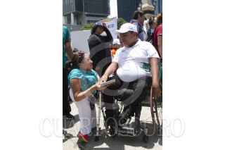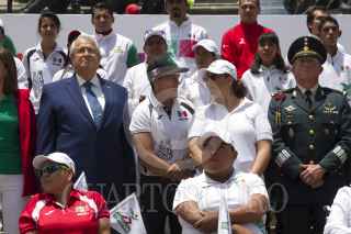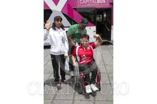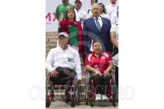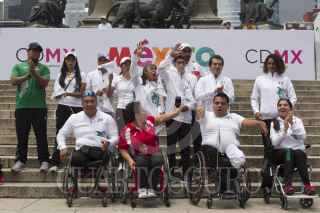 CIUDAD DE MÉXICO, 14AGOSTO2016.- María Guadalupe Gaytán Ochoa, Directora de Deporte Adaptado del DIF Nacional; Víctor Gabriel Espejo Martínez, director del Comité Olímpico Mexicano; el lanzador de disco Ricardo Robles, y la nadadora Patricia Valle, durante la toma de fotografía oficial de la delegación mexicana que participará en los Juegos Paralímpicos Río 2016, en el mes de septiembre. FOTO: MOISÉS PABLO /CUARTOSCURO.COM
