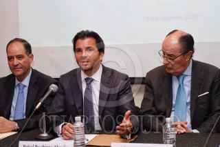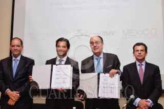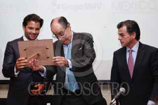 CIUDAD DE MÉXICO, 15AGOSTO2016.- Rafael Pacchiano Alamán, titular de Secretaría de Medio Ambiente, Jaime Ruiz Sacristán, presidente de la Bolsa Mexicana de Valores, y José-Oriol Bosch Par, director de la Bolsa Mexicana de Valores, durante la firma de convenio de colaboración entre ambas instituciones para reducir las emisiones de carbono. FOTO: ISAAC ESQUIVEL /CUARTOSCURO.COM