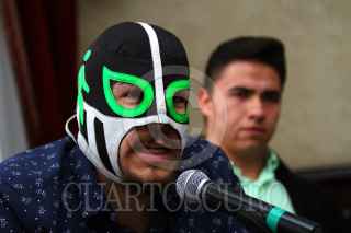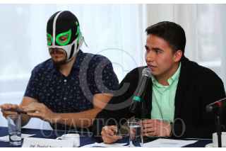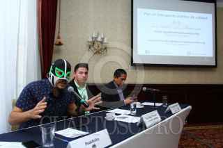 CIUDAD DE MÉXICO, 16AGOSTO2016.- Peátonito, personaje protector del peatón, Daniel Zamudio, del Poder del Consumidor y Alejandro Villegas, líder del Proyecto del Centro, durante la conferencia de prensa en donde presentaron un estudio en el cual destacaron que el 90% de los recursos públicos para transporte y movilidad se destinan a infraestructura vial y sólo 6% van a proyectos de transporte público. Además, denunciaron que la causa de l congestionamiento vial, accidentes, daños a la salud y medio ambiente, es por la promoción e incentivo que los gobiernos realizan a favor de la compra de automóviles, construcción de vialidades y poco transporte público. FOTO: ADOLFO VLADIMIR / CUARTOSCURO.COM