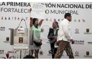 JIUTEPEC, MORELOS, 18AGOSTO2016.- Con escasa participación inició a Primera Reunión Nacional de Desarrollo y Fortalecimiento Municipal con la participación de alcaldes de 16 estados quienes se reunieron para dialogar sobre el futuro de sus municipios. El evento fue encabezado por Matías Quiroz Medina, secretario de gobierno de estado. En la imagen, una activista del Frente Opositor Morelense se manifestó durante el evento portando una cartulina en donde exigía la salida del gobernador Graco Ramírez Abreu. FOTO: MARGARITO PÉREZ RETANA /CUARTOSCURO.COM