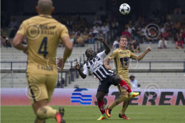 CIUDAD DE MÉXICO, 21AGOSTO2016.- El jugador de Monterrey Yimmi Chará disputa un balón con la cabeza al defensa Puma, Abraham González, en el encuentro de la jornada 6 en el estadio Olímpico, en donde los universitarios ganaron 5-3. FOTO: MOISÉS PABLO /CUARTOSCURO.COM