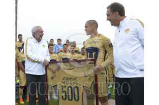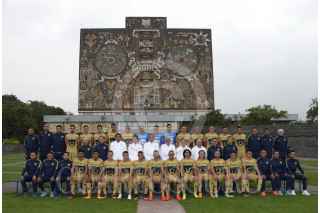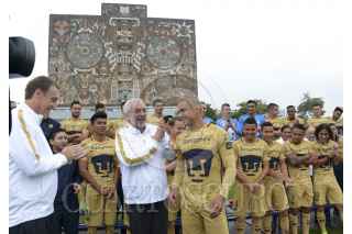 CIUDAD DE MÉXICO, 24AGOSTO2016.- El equipo de fútbol de los Pumas de la UNAM se tomaron la fotografía oficial con la presencia del rector Enrique Graue Wiechers, y con la Biblioteca Central de fondo. FOTO: UNAM /CUARTOSCURO.COM