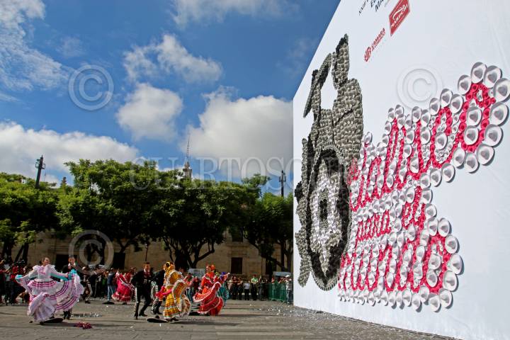 GUADALAJARA, JALISCO, 26AGOSTO.- Esta mañana en la Plaza de la Liberación y en el marco del XXIII Encuentro Internacional del Mariachi y la Charrería, Jalisco impuso un nuevo Récord Guinness con el mosaico de sombreros mas grande del mundo con un total de dos mil 684 piezas, desplazando a Canadá, país que hasta hace unas horas ocupaba el récord con un total de dos mil 30 sombreros. A ya mencionado evento asistieron el Gobernador del Estado, Jorge Aristóteles Sandoval Díaz, el Presidente de la Cámara de Comercio (CANACO), Fernando Topete Dávila y el Presidente Municipal de Guadalajara, Enrique Alfaro Ramírez, mismos que recibieron el reconocimiento mundial por parte de las autoridades del World Record Guinness. FOTO : FERNANDO CARRANZA GARCIA / CUARTOSCURO.COM