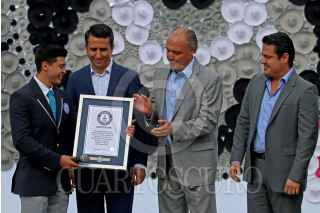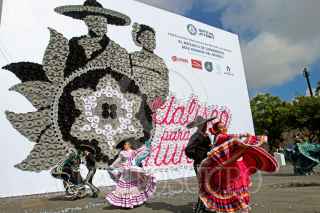 GUADALAJARA, JALISCO, 26AGOSTO.- Esta mañana en la Plaza de la Liberación y en el marco del XXIII Encuentro Internacional del Mariachi y la Charrería, Jalisco impuso un nuevo Récord Guinness con el mosaico de sombreros mas grande del mundo con un total de dos mil 684 piezas, desplazando a Canadá, país que hasta hace unas horas ocupaba el récord con un total de dos mil 30 sombreros. A ya mencionado evento asistieron el Gobernador del Estado, Jorge Aristóteles Sandoval Díaz, el Presidente de la Cámara de Comercio (CANACO), Fernando Topete Dávila y el Presidente Municipal de Guadalajara, Enrique Alfaro Ramírez, mismos que recibieron el reconocimiento mundial por parte de las autoridades del World Record Guinness. FOTO : FERNANDO CARRANZA GARCIA / CUARTOSCURO.COM