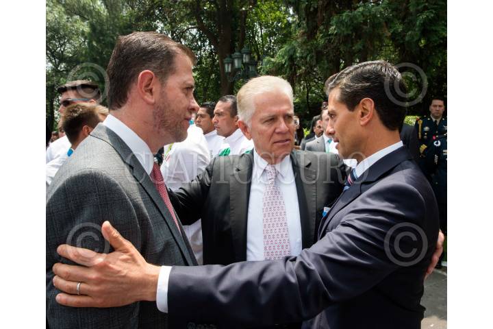CIUDAD DE MÉXICO, 26AGOSTO2016.- Alfredo Castillo titular de la Conade Carlos Padilla dirigente del Comité Olímpico Mexicano (COM) Y el Presidente Enrique Peña Nieto platican previo al evento de la visita de los medallistas olímpicos de Río de Janeiro 2016. FOTO: PRESIDENCIA /CUARTOSCURO.COM