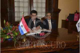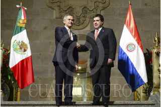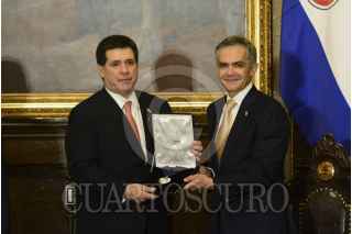 CIUDAD DE MÉXICO, 26AGOSTO2016.- Miguel Ángel Mancera Espinosa, jefe de gobierno de la Ciudad de México, entregó al Presidente de la República del Paraguay, Horacio Manuel Cartes Jara, la Llave, Medalla, réplica de las “Alas de la Ciudad” y Pergamino que lo declaran como Huésped Distinguido de la capital del país. FOTO: CUARTOSCURO.COM