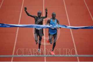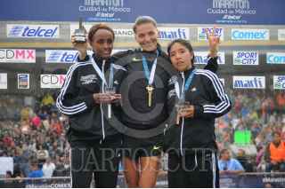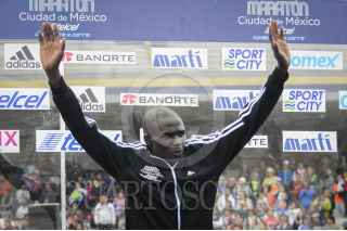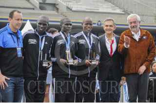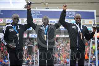 CIUDAD DE MÉXICO, 28AGOSTO2016.- Los kenianos Emmanuel Mnangal, Isaacke Kenboi y Rodgers Ondati ganaron los sitios 1, 2 y 3 en el XXXVI Maratón de la Ciudad de México, luego de culminar la carrera en el estadio Olímpico Universitario de la UNAM. Horacio de la Vega, titular de Indeporte; Miguel Ángel Mancera, jefe de gobierno capitalino, y Enrique Graue Wiechers, rector de la UNAM, entregaron las preseas a los ganadores. FOTO: DIEGO SIMÓN SÁNCHEZ /CUARTOSCURO.COM