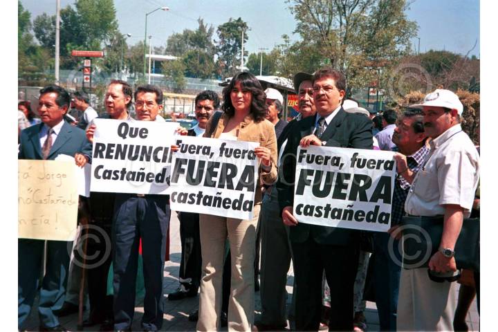 Los diputados locales y federales Dione Anguiano y Alfredo Hernandez Raigosa protestaron a las afueras de Los Pinos en contra del secretario de Relaciones Exteriores. FOTO: Gilberto Molina/CUARTOSCURO.COM