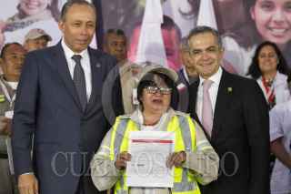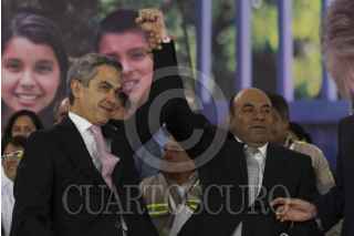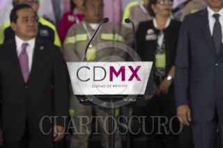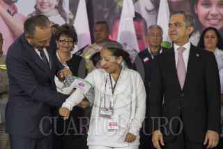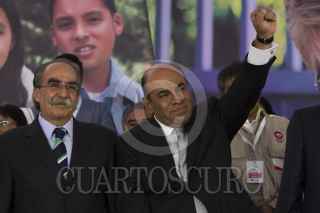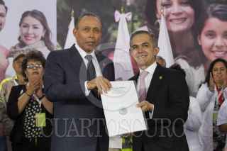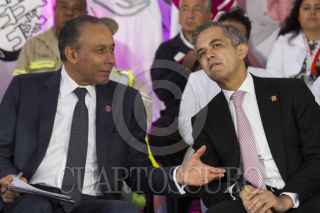 CIUDAD DE MÉXICO, 05SEPTIEMBRE2016.- Miguel Ángel Mancera, Jefe de Gobierno, y Juan Ayala, líder del Sindicato de Trabajadores del Distrito Federal, al finalizar el evento "Más Hospitales y Servicios ISSSTE-CDMX", en la explanada del Monumento a la Revolución. FOTO: MOISÉS PABLO /CUARTOSCURO.COM