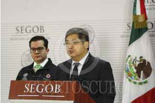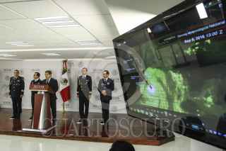 CIUDAD DE MÉXICO, 05SEPTIEMBRE2016.- Ricardo de la Cruz Musalem, director general de Protección Civil, en compañía de Alberto Hernández Unzón, coordinador general del Servicio Metereológico Nacional, durante la conferencia en la que informaron que el huracán Newton tocará tierra esta noche en Baja California Sur. FOTO: ADOLFO VLADIMIR /CUARTOSCURO.COM
