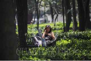 CIUDAD DE MÉXICO, 07SEPTIEMBRE2016.- Una joven habla por teléfono sentada en una banca del bosque de Chapultepec. FOTO: DIEGO SIMÓN SÁNCHEZ /CUARTOSCURO.COM