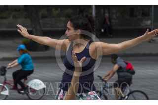CIUDAD DE MÉXICO, 11SEPTIEMBRE2016.- Ejercicios de estiramiento durante el Paseo Ciclista, que cada domingo se celebra en avenida Reforma y otras de vialidades. Aunque en un principio la invitación solo era para pasear en dos ruedas, hoy decenas de ciudadanos lo utilizan para practicar un sin fin de actividades físicas. FOTO: MOISÉS PABLO /CUARTOSCURO.COM