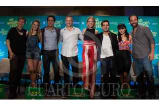 CIUDAD DE MÉXICO, 12SEPTIEMBRE2016.- Mónica Dionne; Regina Pavón; Mario Moran; Nacho G Velilla, director; Fernanda Castillo; Omar Chaparro; Martha Higareda, y Mauricio Argüelles posaron para los medios en la presentación de la película “No Manches Frida”, la cinta se estrena este 16 de septiembre en diferentes salas. FOTO: ANTONIO CRUZ /CUARTOSCURO.COM