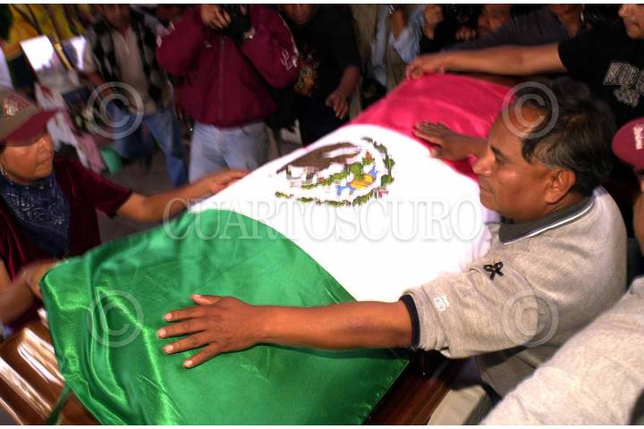 El cuerpo de José Enrique Espinoza Suárez es velado en la plaza principal de San Salvador Atencvo, mientras sus compañeros negocian con autoridades federales en el Antiguo Palacio de Lecumberri. FOTO: Pedro Mera/CUARTOSCURO.COM