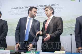 CIUDAD DE MÉXICO, 20SEPTIEMBRE2016.- Gabriel Contreras Salvídar, comisionado presidente del Instituto Federal de Telecomunicaciones (IFT), y Ernesto Nemer Álvarez, titular de la Procuraduría Federal del Consumidor (Profeco), encabezaron una firma de convenio de colaboración entre ambas dependencias de gobierno. FOTO: DIEGO SIMÓN SÁNCHEZ /CUARTOSCURO.COM