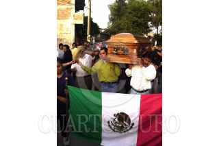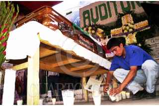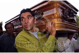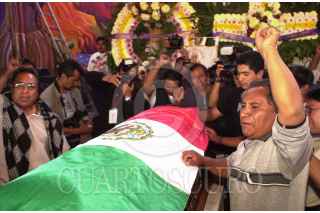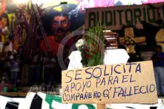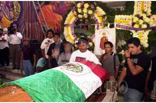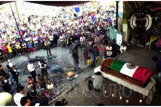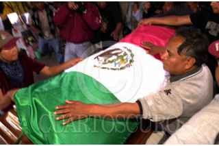 El cuerpo de José Enrique Espinoza Suárez es velado en la plaza principal de San Salvador Atencvo, mientras sus compañeros negocian con autoridades federales en el Antiguo Palacio de Lecumberri. FOTO: Pedro Mera/CUARTOSCURO.COM