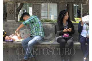 CIUDAD DE MÉXICO, 20SEPTIEMBRE2016.- Un joven le cambia el pañal a su hijo en un banca ubicada sobre la avenida Paseo de la Reforma. El cuidado de los hijos por parte de los hombres contribuye una ayuda a la conservación del empleo de su conyugue. FOTO: ARMANDO MONROY /CUARTOSCURO.COM