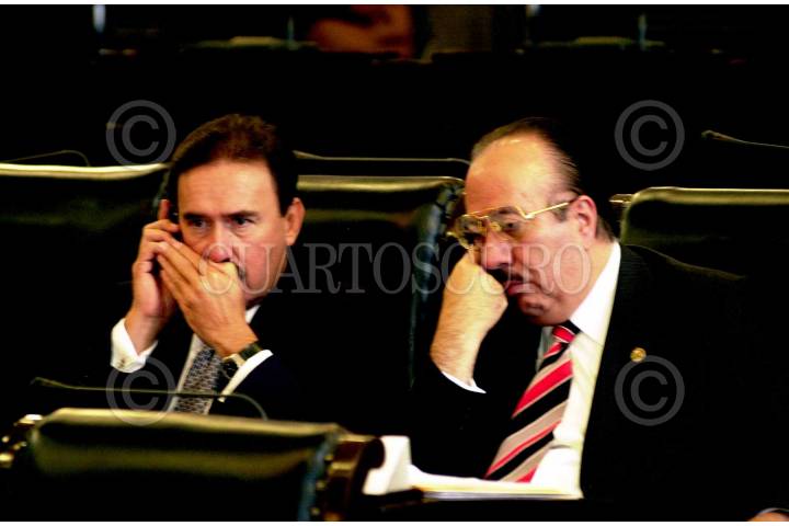 Los senadores panistas Alejandro Zapara Perogordo y Juan José Rodríguez Prats, durante la sesión de la Comisión Permanente que se realizó en el Senado de la República. FOTO: Pedro Mera/CUARTOSCURO.COM