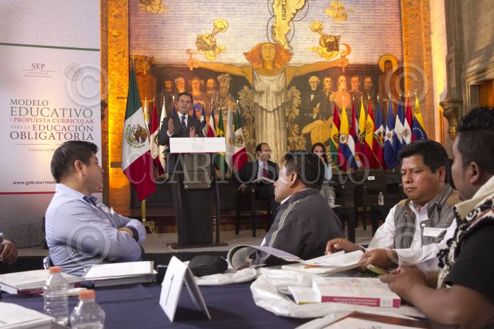 CIUDAD DE MÉXICO, 22SEPTIEMBRE2016.- Aurelio Nuño Mayer, secretario de Educación Pública (SEP), abraza efusivamente a Vitalico Cándido Coheto Martínez, presidente de la Comisión de Asuntos Indígenas, durante el foro de consulta sobre el Modelo Educativo y la Propuesta Curricular para la Educación Obligatoria con el tema Indígena, realizado en la SEP. FOTO: MOISÉS PABLO /CUARTOSCURO.COM