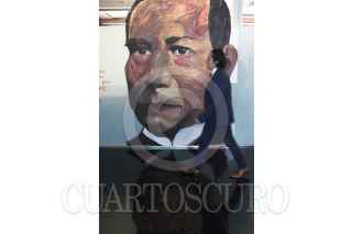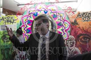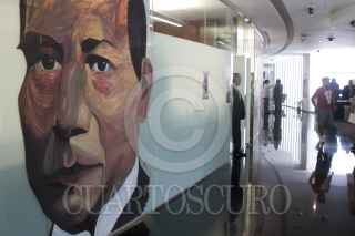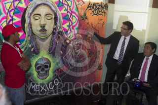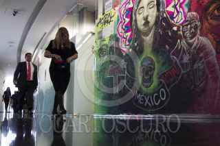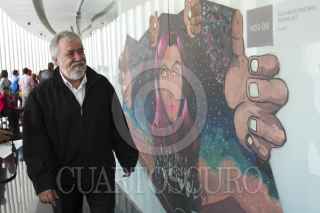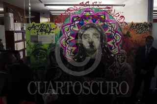 CIUDAD DE MÉXICO, 22SEPTIEMBRE2016.- El senador Alejandro Encinas observa el mural que fue creado afuera de su oficina como parte de la exposición "Muralismo sobre cristales". El político independiente anunció su separación al parlamento para dedicarse de lleno a la Asamblea Constituyente. FOTO: MOISÉS PABLO /CUARTOSCURO.COM