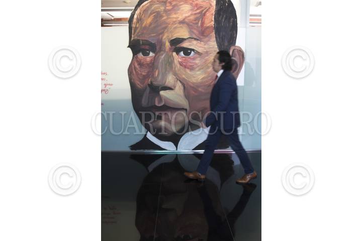 CIUDAD DE MÉXICO, 22SEPTIEMBRE2016.- El senador Alejandro Encinas observa el mural que fue creado afuera de su oficina como parte de la exposición "Muralismo sobre cristales". El político independiente anunció su separación al parlamento para dedicarse de lleno a la Asamblea Constituyente. FOTO: MOISÉS PABLO /CUARTOSCURO.COM