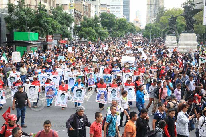 CIUDAD DE MÉXICO, 26SEPTIEMBRE2016.- Padres de los 43 estudiantes de la Normal Rural Raúl Isidro Burgos, estudiantes e integrantes de organizaciones sociales, campesinas y obreras marcharon del Ángel de la Independencia al zócalo de la Ciudad de México en memoria de los desaparecidos en Iguala, Guerrero. FOTO: SAÚL LÓPEZ /CUARTOSCURO.COM