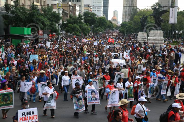 CIUDAD DE MÉXICO, 26SEPTIEMBRE2016.- Padres de los 43 estudiantes de la Normal Rural Raúl Isidro Burgos, estudiantes e integrantes de organizaciones sociales, campesinas y obreras marcharon del Ángel de la Independencia al zócalo de la Ciudad de México en memoria de los desaparecidos en Iguala, Guerrero. FOTO: SAÚL LÓPEZ /CUARTOSCURO.COM