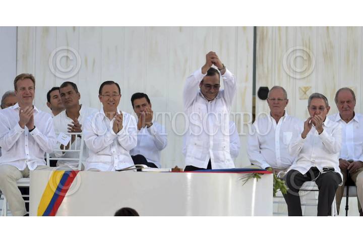 CARTAGENA DE INDIA, COLOMBIA, 26SEPTIEMBRE2016.- Juan Manauel Santos, presidente de Colombia, y Rodrigo Londoño, alías Timochenko" firmaron el histórico acuerdo de paz con el cual buscan poner fina a más de medio siglo de conflicto armado que de deja decenas de miles de muertos y millones de desplazados. El Presidente Enrique Peña Nieto participó hoy como invitado especial en la ceremonia de la firma de los Acuerdos de Paz en Colombia, que ponen fin a un conflicto armado de más de 50 años. FOTO: PRESIDENCIA /CUARTOSCURO.COM