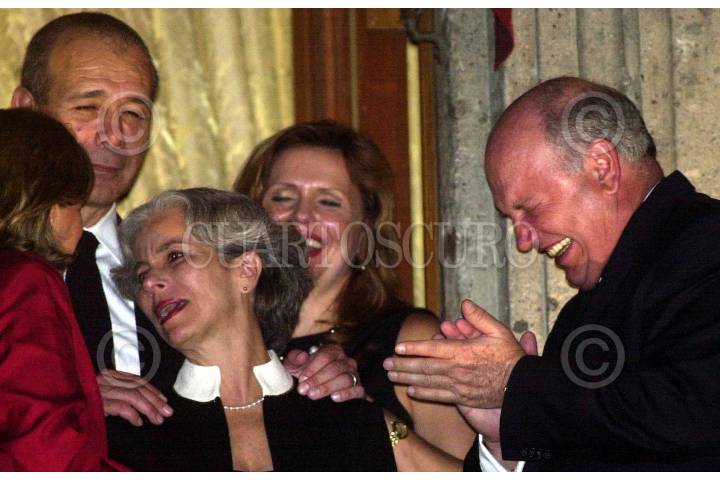 El secretario de Comunicaciones y Transportes, Pedro Cerisola, y su familia platican con el obispo de Ecatepec, Onesimo Cepeda, durante la ceremonia del CXCII aniversario del "grito de Independencia" en Palacio Nacional. FOTO: Juan Pablo Zamora/CUARTOSCURO.COM