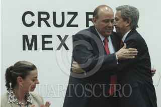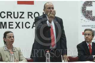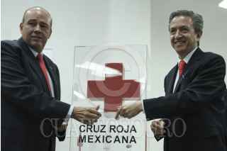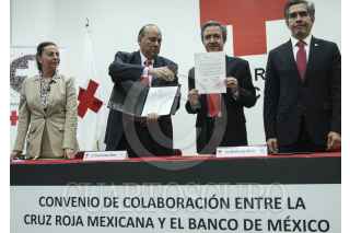 CIUDAD DE MÉXICO, 27SEPTIEMBRE2016.- Fernando Suinaga, director de Cruz Roja Mexicana, y Alejandro Alegre Rabiela, representante del Banco de México, firmaron un acuerdo de colaboración entre ambas instituciones para que incentivar al los ciudadanos a utilizar las monedas que no mantienen en circulación y depositarlas en las alcancías de colecta voluntaria de la Cruz Roja. FOTO: MARÍA JOSÉ MARTÍNEZ /CUARTOSCURO.COM