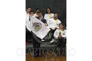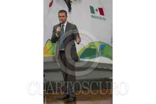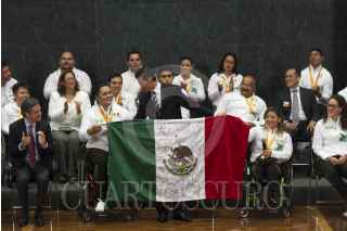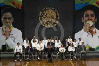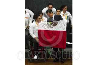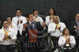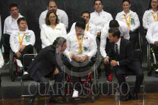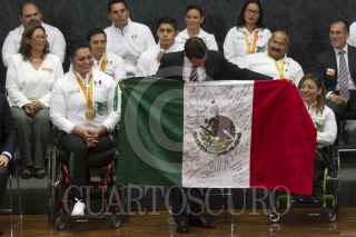 CIUDAD DE MÉXICO, 27SEPTIEMBRE2016.- El Presidente de la República Enrique Peña Nieto se reunió con la delegación que participó en los juegos paralímpicos "Río 2016", esta delegación ganó 14 medallas en esta edición y le exigieron se impulse y apoye más al deporte adaptado. En imagen el mandatario escucha a Amalia Pérez, medallista de oro en levantamiento de potencia. FOTO: MOISÉS PABLO /CUARTOSCURO.COM