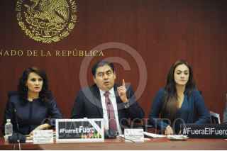 CIUDAD DE MÉXICO, 27SEPTIEMBRE2016.- Senadores del PRD, encabezados por el coordinador de la bancada, Miguel Barbosa, ofrecieron una conferencia de prensa para anunciar que presentaron ante la Mesa Directiva del Senado de la República la solicitud para que se les retire el fuero constitucional al que tienen derecho, por considerarlo “un derecho a la impunidad”. FOTO: DIEGO SIMÓN SÁNCHEZ /CUARTOSCURO.COM