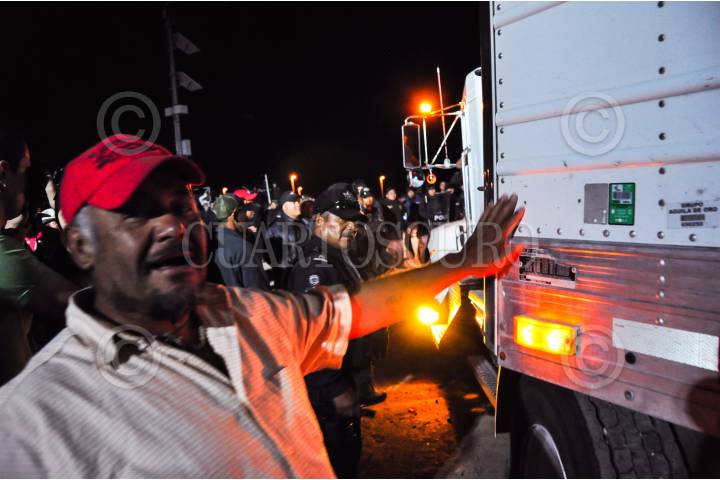 MAZAPIL, ZACATECAS, 06OCTUBRE2016.- Mina Peñasquito considerada la más importante debido a su producción en América Latina suspendió sus actividades debido a que pobladores y transportistas se manifiestan bloqueando el acceso a trabajadores e insumos (más no la salida) debido al incumplimiento de compromisos adquiridos por parte de la empresa minera operada por GoldCorp. La Policía Estatal, Ministerial y Tránsito del Estado, realizó un operativo el martes pasado donde intentaron a los inconformes. FOTO: MISAEL VALTIERRA / CUARTOSCURO.COM