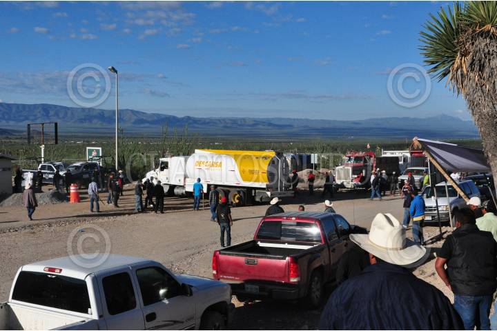 MAZAPIL, ZACATECAS, 06OCTUBRE2016.- Mina Peñasquito considerada la más importante debido a su producción en América Latina suspendió sus actividades debido a que pobladores y transportistas se manifiestan bloqueando el acceso a trabajadores e insumos (más no la salida) debido al incumplimiento de compromisos adquiridos por parte de la empresa minera operada por GoldCorp. La Policía Estatal, Ministerial y Tránsito del Estado, realizó un operativo el martes pasado donde intentaron a los inconformes. FOTO: MISAEL VALTIERRA / CUARTOSCURO.COM
