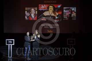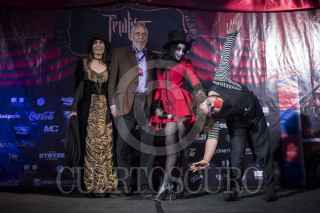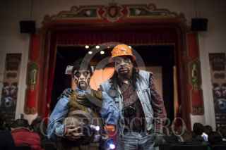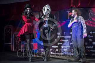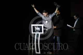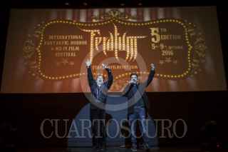 TLALPUJAHUA, MICHOACÁN, 09OCTUBRE2016.- 40 largometrajes de terror, sci-fi y fantasía fueron proyectados en la quinta edición del Feratum Film Fest. El acto de clausura se realizó en el teatro Cenobio Paniagua, con una nueva propuesta circense del circo Atayde Hermanos y dónde fue homenajeada Rosa Gloria Chagoyan "Lola la Trailera" y el cineasta Alfredo Gurrola. En la imagen el director Edgar Nito celebra con el el Premio Nosferatu de bronce, por "Masacre en San José", corto que obtuvo la presea Alucarda en Mejor Director, Mejor Actor, Mejores Efectos Visuales y Música Original. FOTO: ALAN ORTEGA /CUARTOSCURO.COM