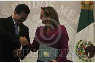 CIUDAD DE MÉXICO, 11OCTUBRE2016.- Claudia Ruiz Massieu, secretaria de Relaciones Exteriores, ofreció conferencia conjunta con Hugo Martínez, canciller de El Salvador. Ambos funcionarios firmaron un convenio de colaboración que manifiesta la solidaridad entre ambas naciones. FOTO: MARÍA JOSÉ MARTÍNEZ /CUARTOSCURO.COM
