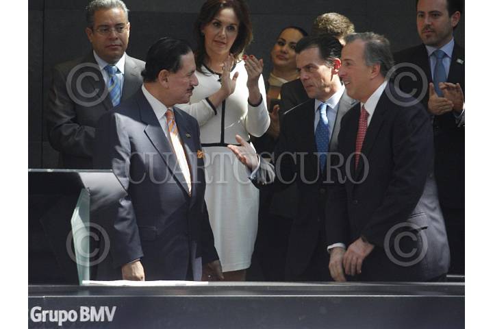 CIUDAD DE MÉXICO, 13OCTUBRE2016.- Luis Robles Miaja, presidente de la Asociación de Bancos de México, José Oriol Bosch Par, director general de la BMV, Juan Francisco Ealy Ortiz, presidente de El Universal, y José Antonio Meade, secretario de Hacienda, durante la celebración por los cien años del periódico en la Bolsa Mexicana de Valores. FOTO: ISAAC ESQUIVEL /CUARTOSCURO.COM