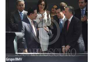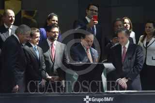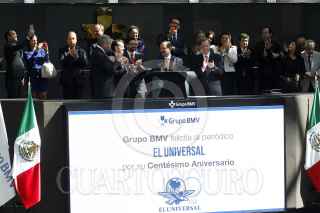 CIUDAD DE MÉXICO, 13OCTUBRE2016.- Luis Robles Miaja, presidente de la Asociación de Bancos de México, José Oriol Bosch Par, director general de la BMV, Juan Francisco Ealy Ortiz, presidente de El Universal, y José Antonio Meade, secretario de Hacienda, durante la celebración por los cien años del periódico en la Bolsa Mexicana de Valores. FOTO: ISAAC ESQUIVEL /CUARTOSCURO.COM