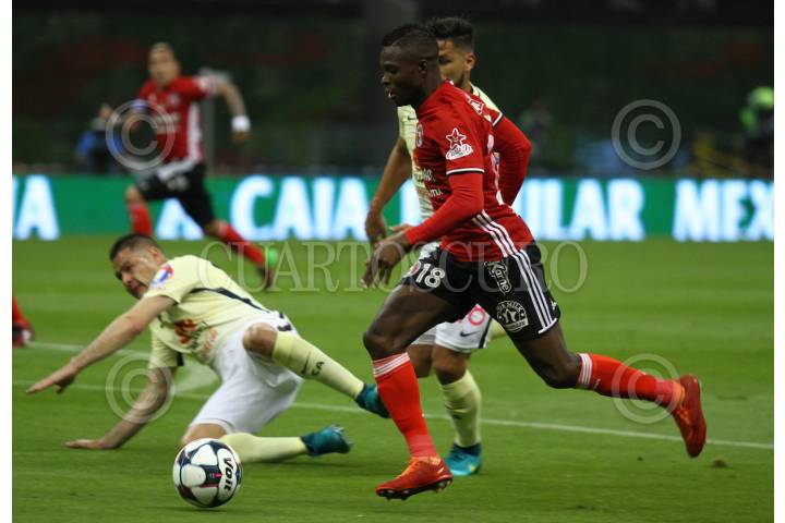 CIUDAD DE MÉXICO, 15OCTUBRE2016.- Las Águilas del América vencieron en el estadio Azteca un gol por cero a los Xolos de Tijuana, en el partido correspondiente a la jornada 13 del Torneo Clausura 2016. En la imagen, Michael Arrollo (11), celebra su gol con el que los azulcremas ganan el encuentro. FOTO: ADOLFO VLADIMIR /CUARTOSCURO.COM