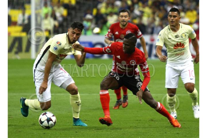 CIUDAD DE MÉXICO, 15OCTUBRE2016.- Las Águilas del América vencieron en el estadio Azteca un gol por cero a los Xolos de Tijuana, en el partido correspondiente a la jornada 13 del Torneo Clausura 2016. En la imagen, Michael Arrollo (11), celebra su gol con el que los azulcremas ganan el encuentro. FOTO: ADOLFO VLADIMIR /CUARTOSCURO.COM