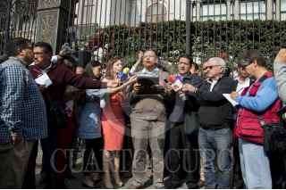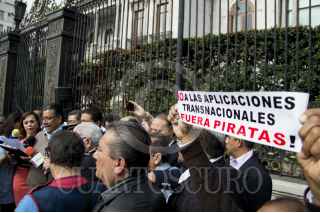 CIUDAD DE MÉXICO, 20CTUBRE2016.-Ignacio Rodríguez, vocero del Movimiento Nacional Taxista, en compañía de dirigentes estatales de transportistas, ofreció conferencia para medios de comunicación frente a las inmediaciones de la Secretaría de Gobernación. Los taxistas inconformes declararon que de no haber un diálogo con el Secretario de Gobernación Miguel Ángel Osorio Chong, se recurrirá a un paro nacional indefinido. De igual modo establecieron que el gobierno mantiene un contubernio económico y político con las empresas privadas que ofrecen servicio de traslado, dígase UBER y Cabify. FOTO: GALO CAÑAS /CUARTOSCURO.COM