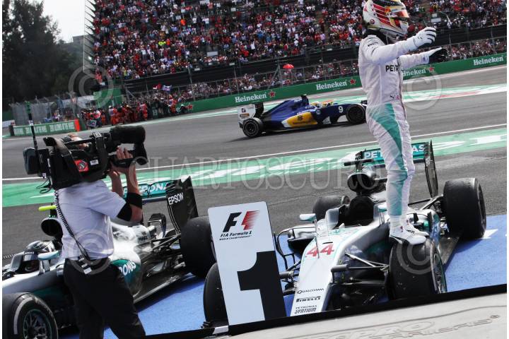 CIUDAD DE MÉXICO, 30OCTUBRE2016.- Lewis Hamilton y Nico Rosberg, ambos de Escudería Mercedes Petronas, y Sebastián Vettel, de Escudería Ferrari, obtuvieron los tres primeros lugares durante la competencia automovilística del “Gran Premio de México 2016”. Al finalizar la premiación el ingeniero Tony Walton de la Escudería Mercedes también fue homenajeado. FOTO: MARÍA JOSÉ MARTÍNEZ /CUARTOSCURO.COM