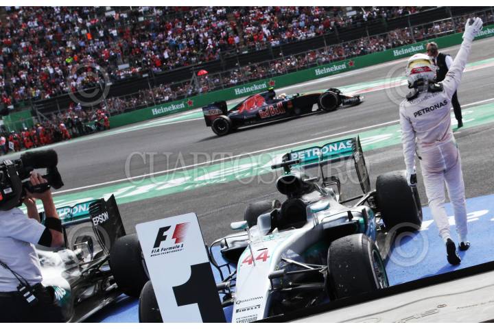 CIUDAD DE MÉXICO, 30OCTUBRE2016.- Lewis Hamilton y Nico Rosberg, ambos de Escudería Mercedes Petronas, y Sebastián Vettel, de Escudería Ferrari, obtuvieron los tres primeros lugares durante la competencia automovilística del “Gran Premio de México 2016”. Al finalizar la premiación el ingeniero Tony Walton de la Escudería Mercedes también fue homenajeado. FOTO: MARÍA JOSÉ MARTÍNEZ /CUARTOSCURO.COM