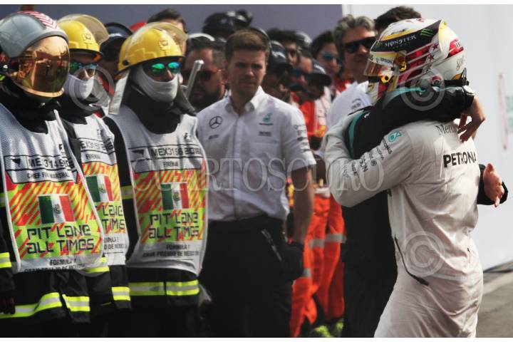 CIUDAD DE MÉXICO, 30OCTUBRE2016.- Lewis Hamilton y Nico Rosberg, ambos de Escudería Mercedes Petronas, y Sebastián Vettel, de Escudería Ferrari, obtuvieron los tres primeros lugares durante la competencia automovilística del “Gran Premio de México 2016”. Al finalizar la premiación el ingeniero Tony Walton de la Escudería Mercedes también fue homenajeado. FOTO: MARÍA JOSÉ MARTÍNEZ /CUARTOSCURO.COM