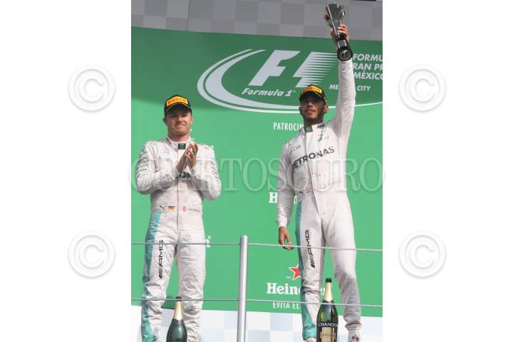 CIUDAD DE MÉXICO, 30OCTUBRE2016.- Lewis Hamilton y Nico Rosberg, ambos de Escudería Mercedes Petronas, y Sebastián Vettel, de Escudería Ferrari, obtuvieron los tres primeros lugares durante la competencia automovilística del “Gran Premio de México 2016”. Al finalizar la premiación el ingeniero Tony Walton de la Escudería Mercedes también fue homenajeado. FOTO: MARÍA JOSÉ MARTÍNEZ /CUARTOSCURO.COM