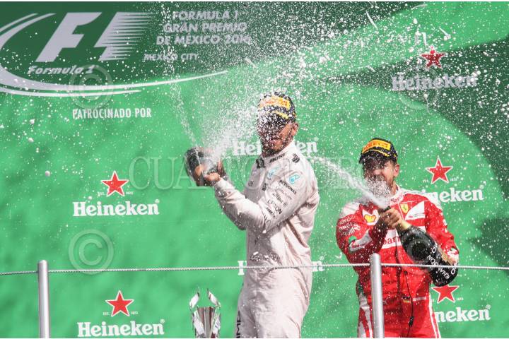 CIUDAD DE MÉXICO, 30OCTUBRE2016.- Lewis Hamilton y Nico Rosberg, ambos de Escudería Mercedes Petronas, y Sebastián Vettel, de Escudería Ferrari, obtuvieron los tres primeros lugares durante la competencia automovilística del “Gran Premio de México 2016”. Al finalizar la premiación el ingeniero Tony Walton de la Escudería Mercedes también fue homenajeado. FOTO: MARÍA JOSÉ MARTÍNEZ /CUARTOSCURO.COM